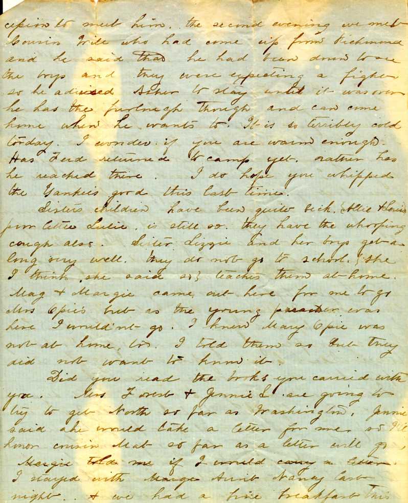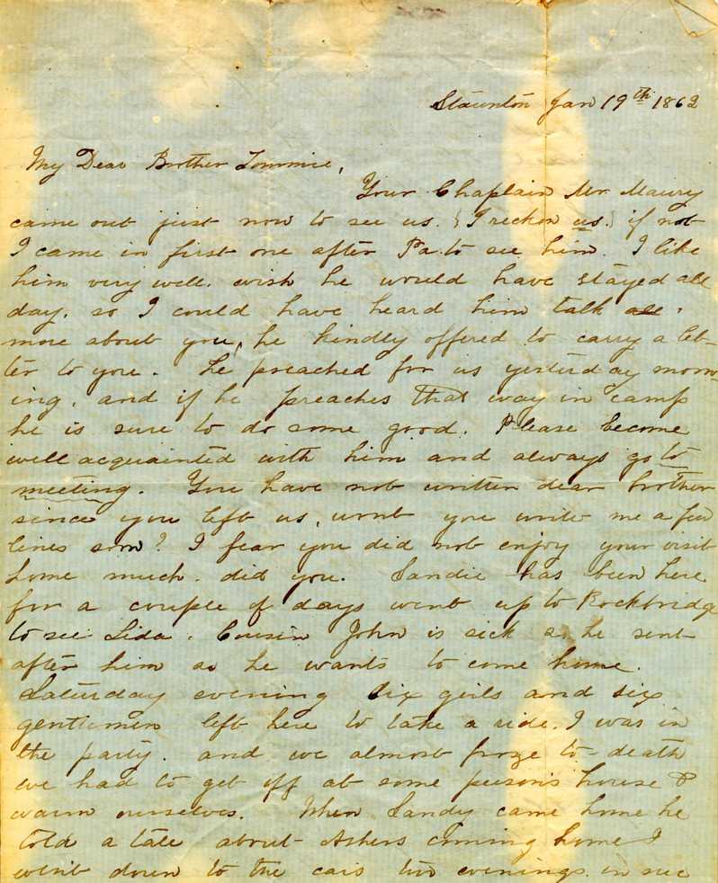 Your Chaplain Mr. Maury came out just now to see us (I reckon us) if not I came in first one after Pa to see him. I like him very well, wish he would have stayed all day, so I could have heard him talk all more about you, he kindly offered to carry a letter to you. He preached for us yesterday morning, and if he preaches that way in camp he is sure to do some good. Please become well acquainted with him and always go to meeting. You have not written dear brother since you left us, wont you write me a few lines soon? I fear you did not enjoy your visit home much. did you. Sandie has been here for a couple of days went up to Rockbridge to see Lida. Cousin John is sick as he sent after him as he wants to come home. Saturday evening six girls and six gentlemen left here to take a ride. I was in the party and we almost froze to death we had to get off at some person's house & warm ourselves. When Sandy came home he told a tale about Ashers coming home I went down to the cars two evenings in succession to meet him. The second evening we met Cousin Will who had come up from Richmond and he said that he had been down to see the boys and they were expecting a fight so he advised Asher to stay until it was over. He has the furlough though and can come home when he wants to. It is so terribly cold today. I wonder if you are warm enough. Has Fred returned to camp yet. rather has he reached there. I do hope you whipped the Yankees good this last time.
