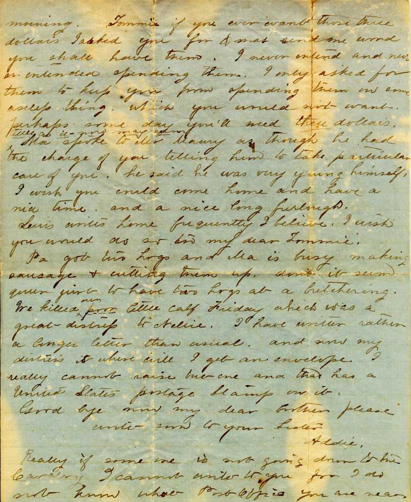 Pa got two hogs and Ma is busy making sausage and cutting them up. don't it seem queer just to have two hogs at a butchering. We killed our poor little calf Friday which was a great distress to Nellie. I have written rather a longer letter than usual. and now my distress is where I will get an envelope. I really cannot raise but one and that has a United States postage stamp on it.